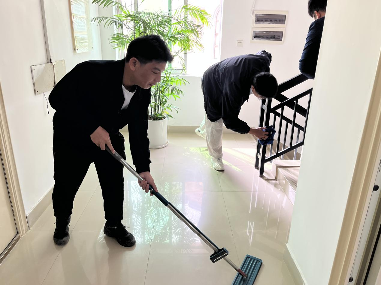 阅读分享结束后,学生党员们将雷锋精神转化为实际行动,开展楼道环境卫生清洁实践活动。大家分工协作、认真细致,手持扫帚、抹布等工具,对公共楼道进行全面清扫,以实实在在的劳动践行雷锋精神,真正做到知行合一,让雷锋精神在实践中落地生根、熠熠生辉。